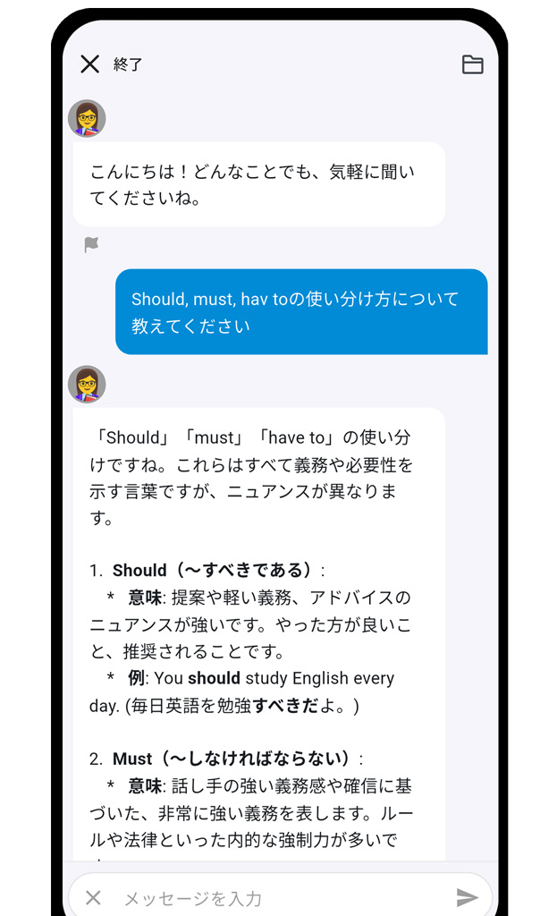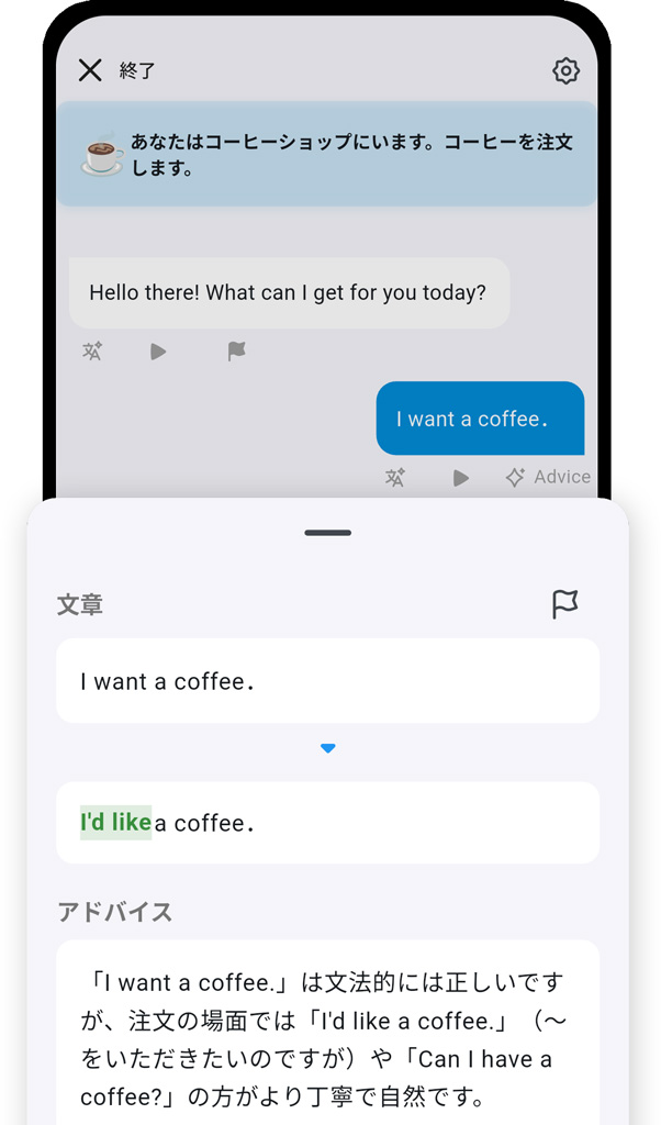 会話の練習相手はAIなので気軽に会話できます。会話しながらリアルタイムで英語のニュアンスやフレーズの改善点を具体的にアドバイスします。